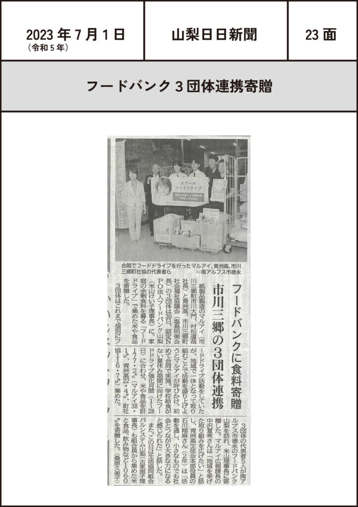 (2023.7.1)フードバンク 3団体連携寄贈 2023-07-01 投稿先 マルアイのこと, 山梨日日新聞 2023 フードバンク 山梨日日新聞 ← 過去の投稿へ 次の投稿へ → コメントを残すメールアドレスが公開されることはありません。 ※ が付いている欄は必須項目ですコメント ※ 名前 メール サイト
