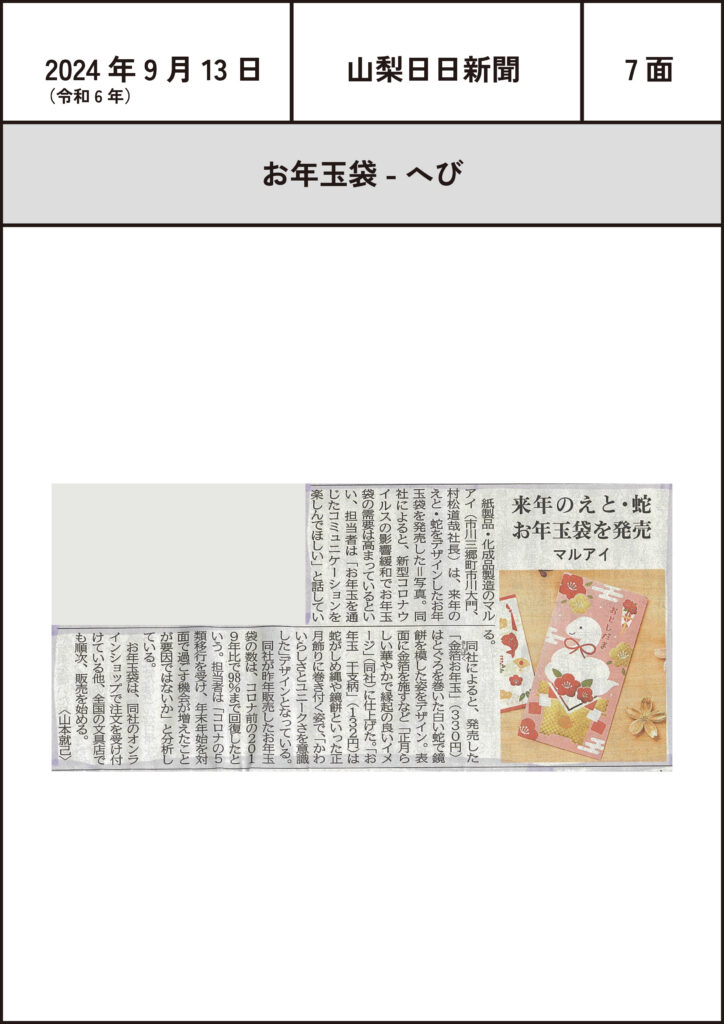 (2024.9.13)お年玉袋 へび 2024-09-13 投稿先 商品のこと, 山梨日日新聞 2024 お年玉袋 山梨日日新聞 ← 過去の投稿へ 次の投稿へ → コメントを残すメールアドレスが公開されることはありません。 ※ が付いている欄は必須項目ですコメント ※ 名前 メール サイト