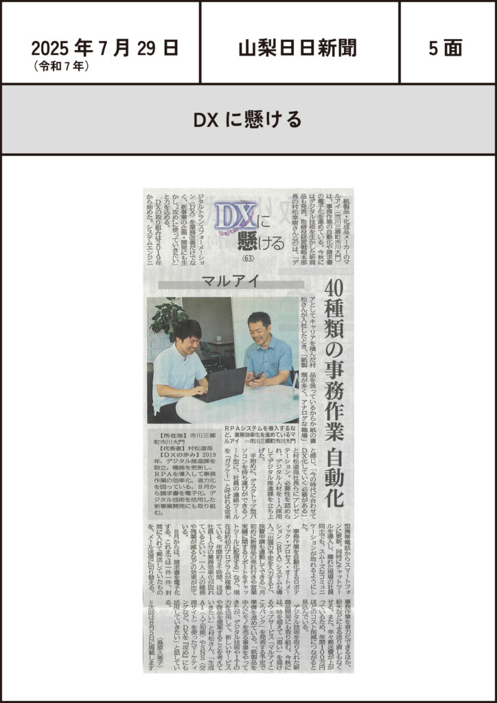 (2025.7.29)DXに懸ける 2025-07-29 投稿先 マルアイのこと, 山梨日日新聞 2025 DXに懸ける 山梨日日新聞 ← 過去の投稿へ 次の投稿へ → コメントを残すメールアドレスが公開されることはありません。 ※ が付いている欄は必須項目ですコメント ※ 名前 メール サイト