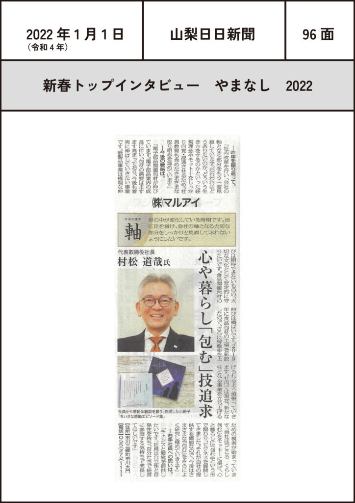 (2022.1.1)新春トップインタビュー 2022 2022-01-01 投稿先 《 トップインタビュー 》, 山梨日日新聞 2022 トップインタビュー 山梨日日新聞 ← 過去の投稿へ 次の投稿へ → コメントを残すメールアドレスが公開されることはありません。 ※ が付いている欄は必須項目ですコメント ※ 名前 メール サイト