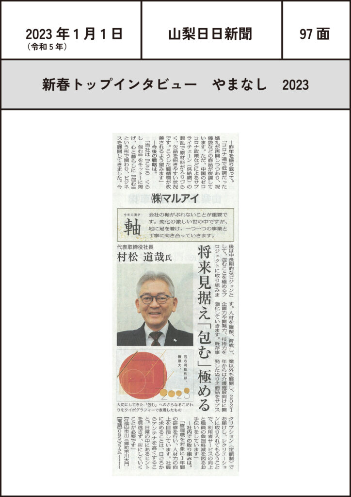 (2023.1.1)新春トップインタビュー 2023 2023-01-01 投稿先 《 トップインタビュー 》, 山梨日日新聞 2023 トップインタビュー 山梨日日新聞 ← 過去の投稿へ 次の投稿へ → コメントを残すメールアドレスが公開されることはありません。 ※ が付いている欄は必須項目ですコメント ※ 名前 メール サイト
