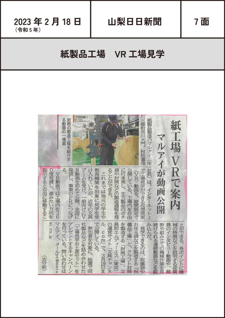 (2023.2.18)紙製品工場 VR工場見学 2023-02-18 投稿先 マルアイのこと, 山梨日日新聞 2023 VR工場見学 山梨日日新聞 ← 過去の投稿へ 次の投稿へ → コメントを残すメールアドレスが公開されることはありません。 ※ が付いている欄は必須項目ですコメント ※ 名前 メール サイト