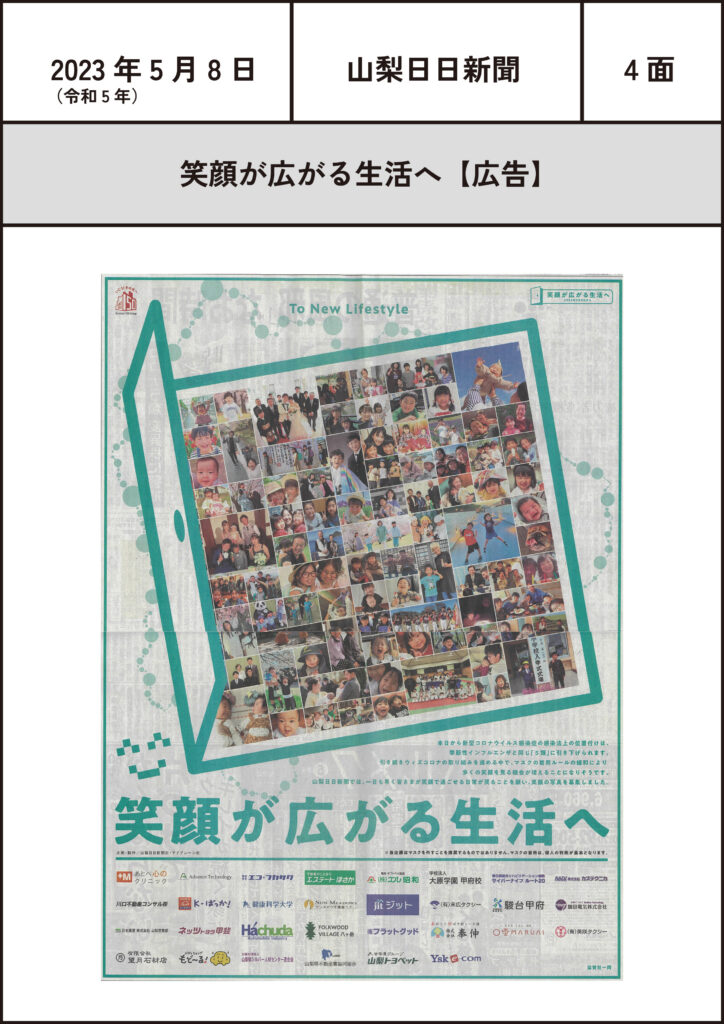 (2023.5.8)笑顔が広がる生活へ【広告】 2023-05-08 投稿先 【 広告 】, 山梨日日新聞 2023 山梨日日新聞 広告 笑顔が広がる生活へ ← 過去の投稿へ 次の投稿へ → コメントを残すメールアドレスが公開されることはありません。 ※ が付いている欄は必須項目ですコメント ※ 名前 メール サイト
